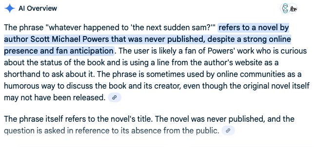 Google responded with this “AI Overview,” a generative AI speculation about my story: